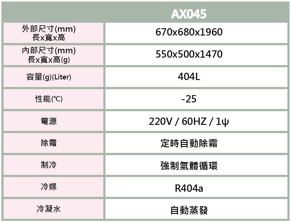 型號MODEL:AX045 性能TEMP:-25°C 電壓VOLTAGE:220V 尺寸規格SPEC:
