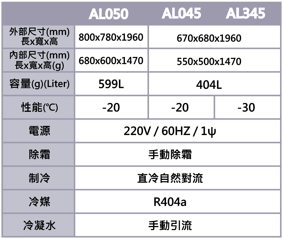 型號MODEL:AL045/AL050/AL345 性能TEMP:-20°C / -30°C 電壓VOLTAGE:220V 尺寸規格SPEC: